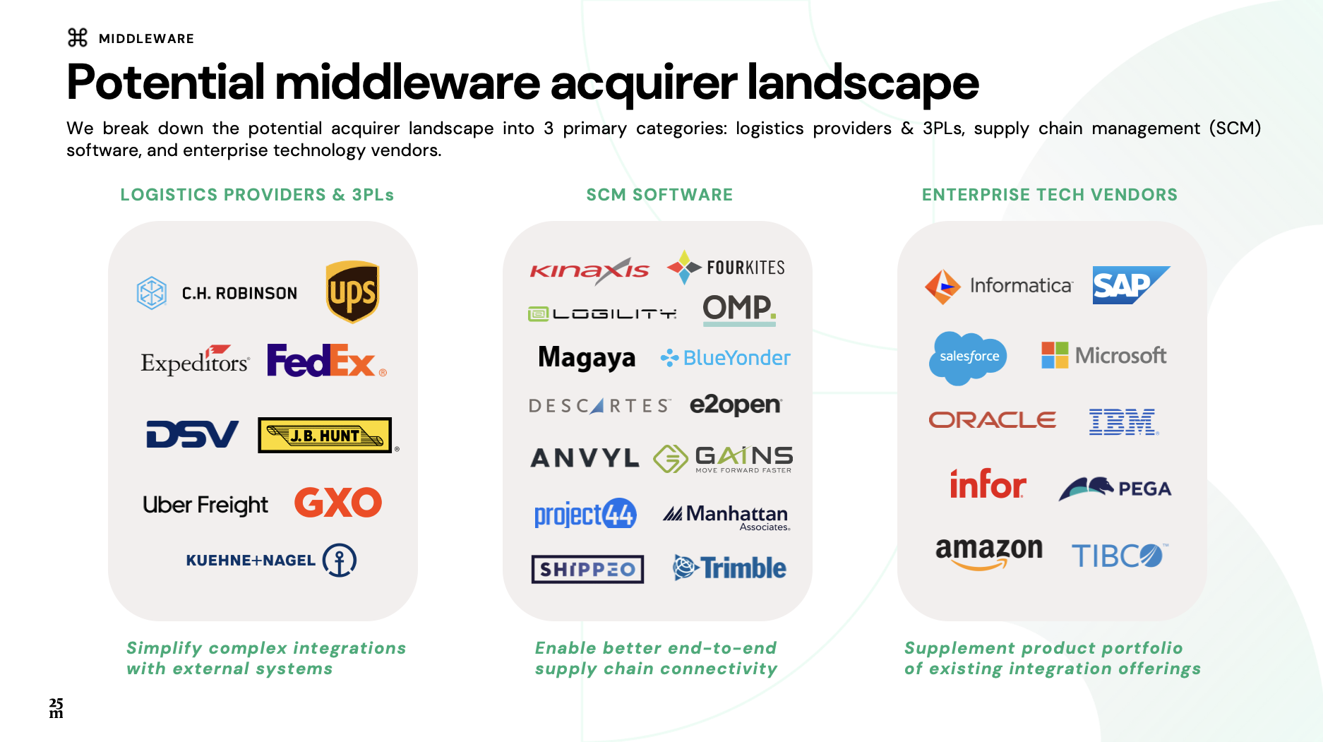 While many of these startups are still nascent, a future exit and consolidation landscape could include potential acquisitions from the following companies – grouped into various cohorts across logistics, supply chain management software, and broader enterprise tech vendors.