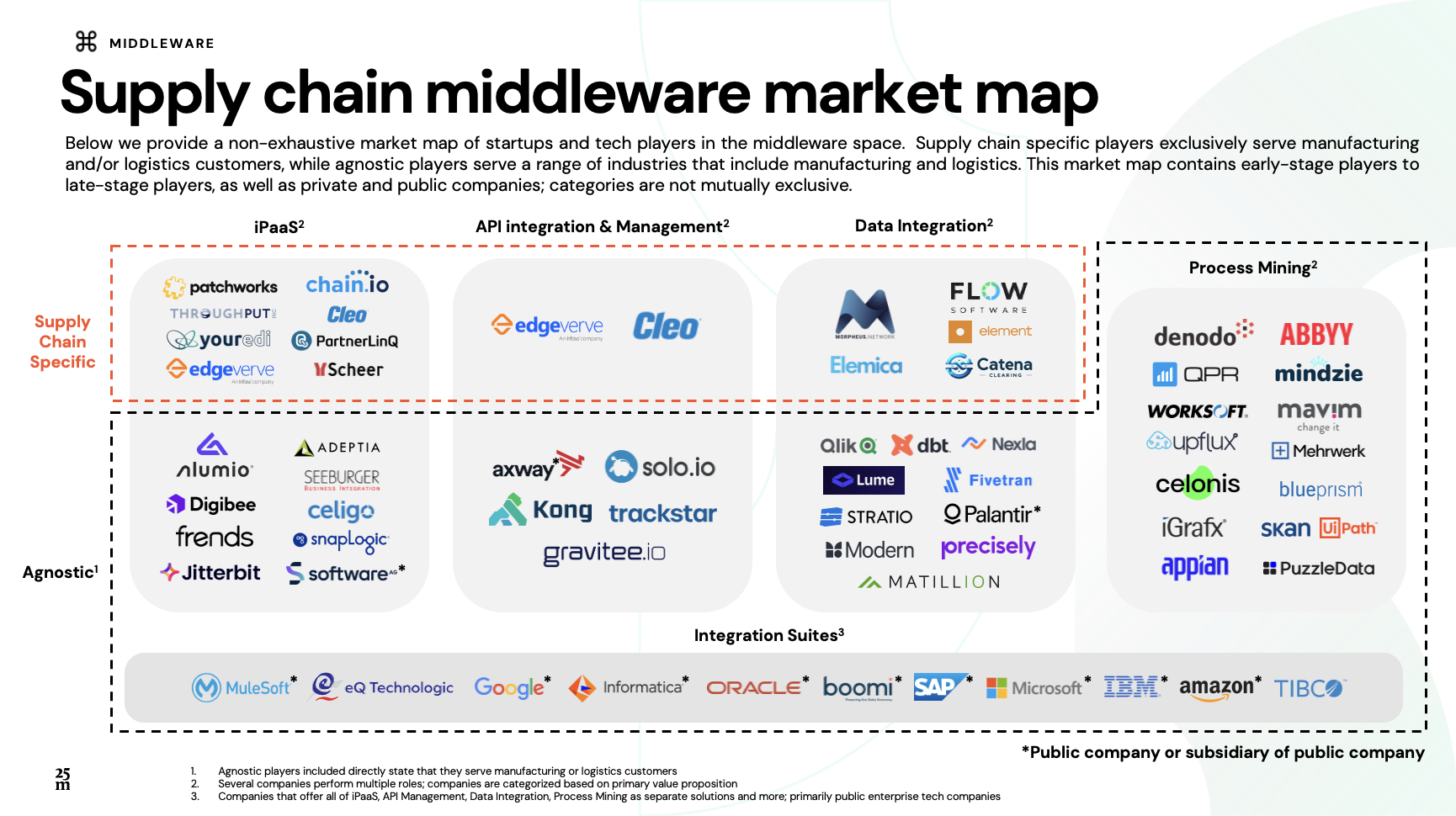 Taking a closer look at some of the companies represented in the funding graph, we created a non-exhaustive market map of startups operating at the intersection of supply chain and middleware. While agnostic solutions (which include supply chain-focused offerings in part) make up a crowded field, there are far fewer companies focused exclusively on the supply chain arena – leaving open potential white space for those solving industry-specific pain points. We also feature incumbent solutions in the market map to illustrate the breadth of their offerings.