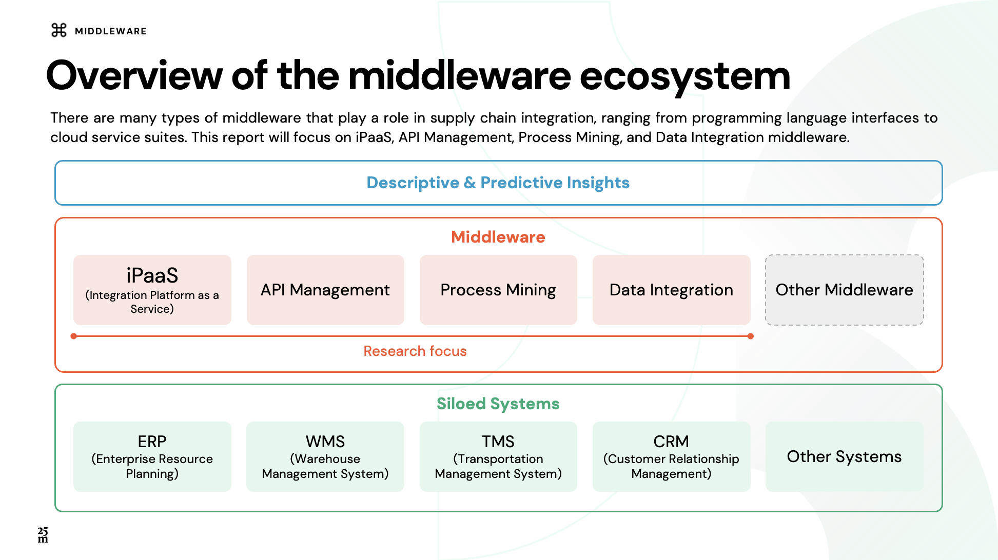 We focus on trends, startups, and technologies in the middleware market, with an emphasis on Integration Platform as a Service (iPaaS), API Integration & Management, Process Mining, and Data Integration solutions that can serve supply chain customers (defined for our purposes as the manufacturing and logistics verticals). For these organizations, this includes solutions that integrate ERPs, CRMs, TMSs (Transportation Management Systems), WMSs (Warehouse Management Systems), and other systems and facilitate data exchange. We also focus primarily on non-open-source solutions and exclude generalist workflow automation tools.