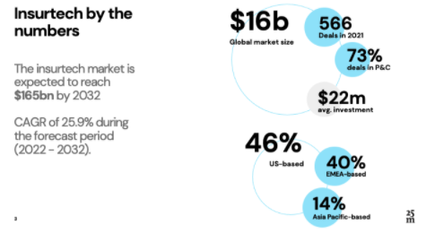 The insurtech market is valued at $16.6 billion in 2022 and is expected to grow at an impressive rate reaching $165.4 billion by 2032.i As an investor, this represents an attractive time to enter space, as the market is expected to boom in the next 10 years.